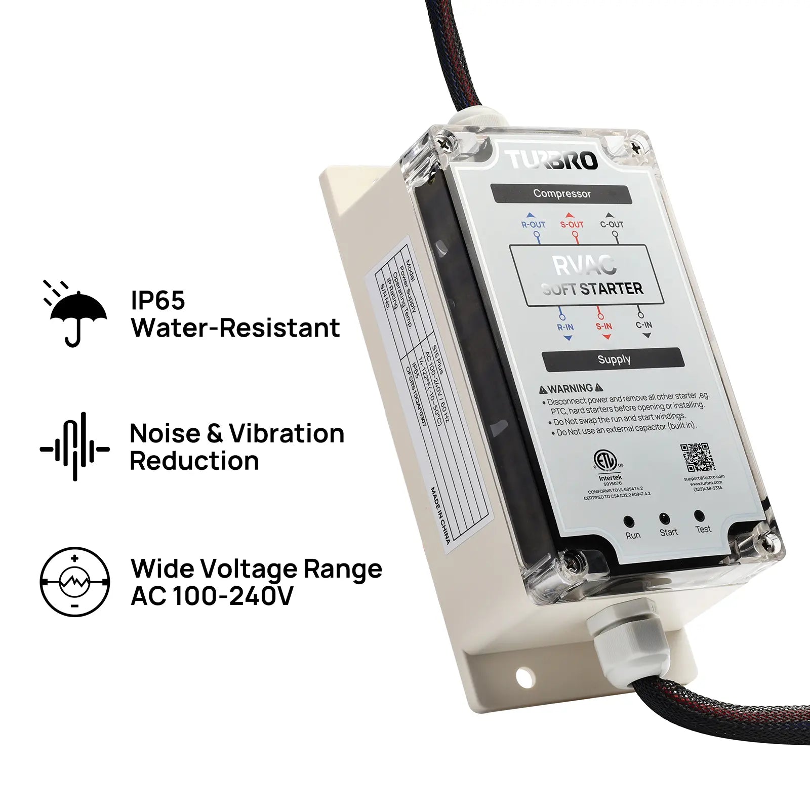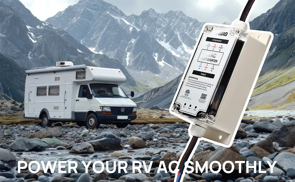 - Startup Power Reduction: Lowers the power required to start your RV AC by 60-75%, preventing tripped breakers and power failures. This supports the AC and other appliances, such as fans, refrigerators, and TVs.